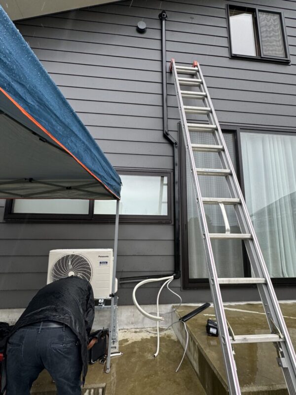取付中、雨風が酷い中、カッパを着用し、脚立にのぼって重い荷物を運んだりと作業されておられる姿を見て、いつか脚立や梯子が倒れるのではないかとヒヤヒヤしました(゚o゚;;